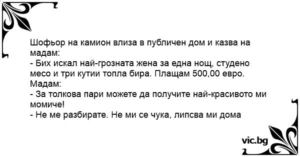 Шофьор на камион влиза в публичен дом и казва на мадам: