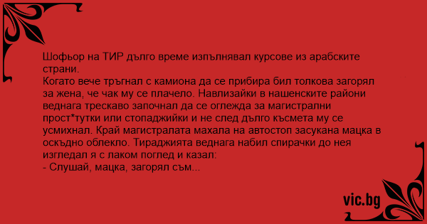 Когато вече тръгнал с камиона да се прибира бил толкова загорял за жена, че чак му се плачело. Навлизайки в нашенските райони веднага трескаво започнал да се оглежда за магистрални пpoctиtуtkи или стопаджийки и не след дълго късмета му се усмихнал. Край магистралата махала на автостоп засукана мацка в оскъдно облекло. Тираджията веднага набил спирачки до нея изгледал я с лаком поглед и казал: