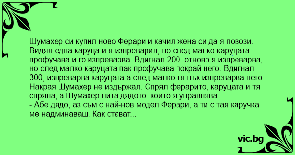 Видял една каруца и я изпреварил, но след малко каруцата профучава и го изпреварва. Вдигнал 200, отново я изпреварва, но след малко каруцата пак профучава покрай него. Вдигнал 300, изпреварва каруцата а след малко тя пък изпреварва него. Накрая Шумахер не издържал. Спрял ферарито, каруцата и тя спряла, а Шумахер пита дядото, който я управлява: