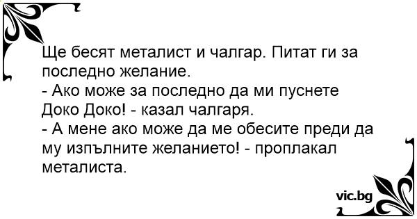 - А мене ако може да ме обесите преди да му изпълните желанието! - проплакал металиста.