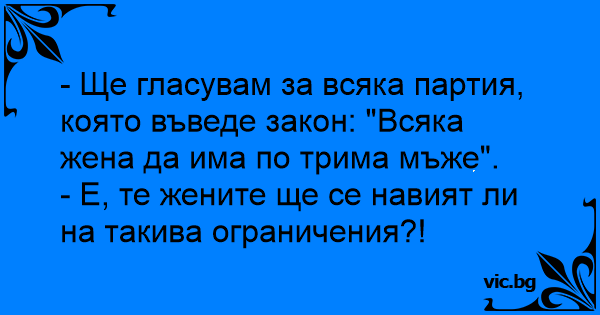 - Ще гласувам за всяка партия, която въведе закон: "Всяка жена да има по трима мъже".