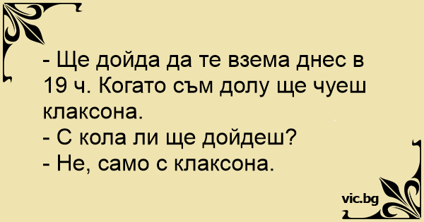 - Ще дойда да те взема днес в 19 ч. Когато съм долу ще чуеш клаксона.