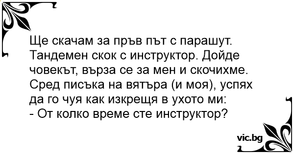 Ще скачам за първи път с парашут с инструктор. Дойде човекът, върза се за мен и скочихме. Сред моите писъци и тези на вятъра човекът изкрещя в ухото ми: