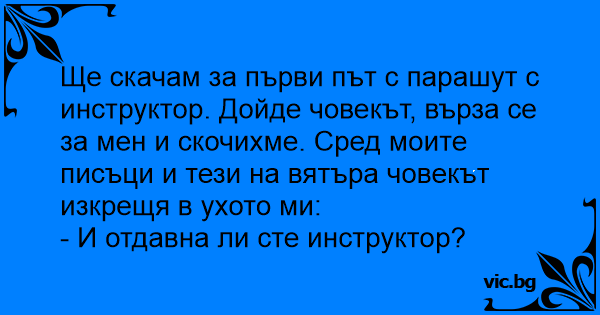 Ще скачам за първи път с парашут с инструктор. Дойде човекът, върза се за мен и скочихме. Сред моите писъци и тези на вятъра човекът изкрещя в ухото ми: