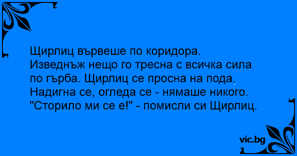 Изведнъж нещо го тресна с всичка сила по гърба. Щирлиц се просна на пода. Надигна се, огледа се - нямаше никого.