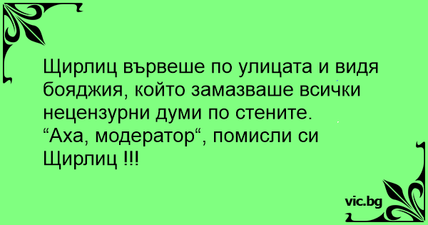 Щирлиц вървеше по улицата и видя бояджия, който замазваше всички нецензурни думи по стените.