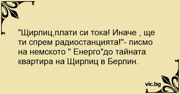 "Щирлиц,плати си тока! Иначе , ще ти спрем радиостанцията!"- писмо на немското " Енерго"до тайната квартира на Щирлиц в Берлин.