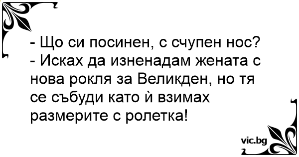 - Исках да изненадам жената с нова рокля за Великден, но тя се събуди като ѝ взимах размерите с ролетка!