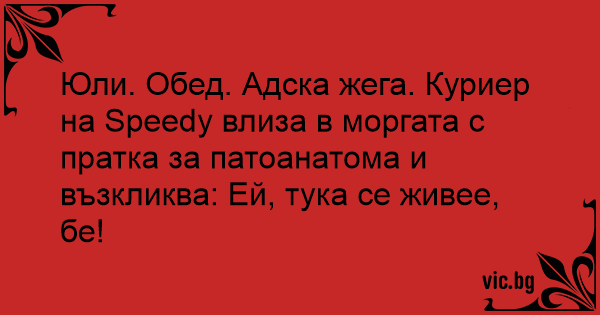 Юли. Обед. Адска жега. Куриер на Speedy влиза в моргата с пратка за патоанатома и възкликва: Ей, тука се живее, бе!