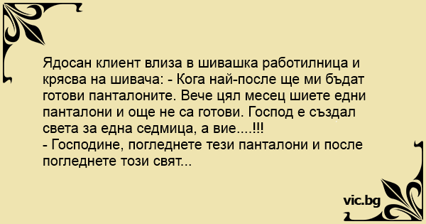 Ядосан клиент влиза в шивашка работилница и крясва на шивача: - Кога най-после ще ми бъдат готови панталоните. Вече цял месец шиете едни панталони и още не са готови. Господ е създал света за една седмица, а вие....!!!