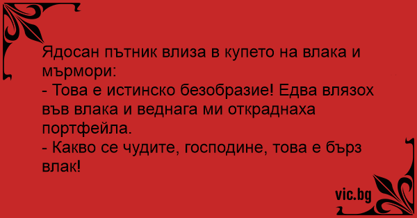 Ядосан пътник влиза в купето на влака и мърмори: