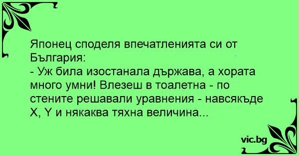 - Уж била изостанала държава, а хората много умни! Влезеш в тоалетна - по стените решавали уравнения - навсякъде Х, Y и някаква тяхна величина...