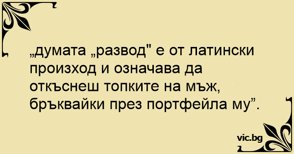 „думата „развод" е от латински произход и означава да откъснеш топките на мъж, бръквайки през портфейла му”.