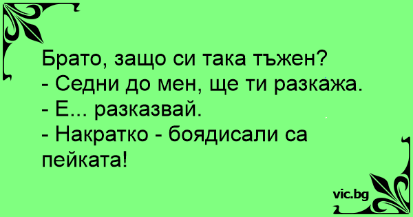 Сидить чоловік на лавці з засмученою фізіономією. До нього підходить інший і питає: — Ти чого сумуєш? У чому справа? — Сідай поруч, розповім. Мужик сідає. — Річ у тім, що лавка пофарбована...