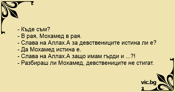 - Где я? - В раю, Мухаммед, в раю. - Слава Аллаху. А про девственниц правда? - Правда, Мухаммед. Правда.. - Слава Аллаху. А почему у меня грудь и ...?! - Понимаешь, Мухаммед, девственниц не хватает...