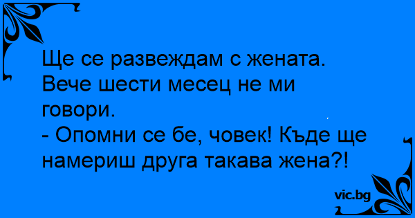 Mujeres difíciles de encontrar Earl and Bubba are quietly sitting in a boat fishing, chewing tobacco and drinking beer when suddenly Bubba says: Husband: I want divorce. My wife hasn't spoken to me in six months. — Pai, vou me divorciar. Tem seis meses que minha mulher não fala comigo.,O pai fica em silêncio, bebe um gole de cerveja e diz:,— Pense bem, meu filho. Mulher assim é difícil de arranjar. - Ще се развеждам. Вече шест месеца жена ми не ми говори. - Ти си луд! Къде ще намериш друга такава жена? - Микола, ти знаєш, я розводжуся із дружиною. Вона вже шість місяців із мною не розмовляє. - Ну, що ти, Іван, одумайся! Де ти ще знайдеш таку дружину? Un tipo le dice a su abogado: - Quiero divorciarme. Mi esposa no me ha hablado en seis meses. El abogado le responde: - ¿Está usted seguro? ¡Esposas así no se consiguen fácilmente! Två män i Norrland sitter och pimplar och filosoferar på riktiga mäns vis och dricker öl. Efter att ha suttit stilla i några timmar så säger Jim till Tommy: – Hörrudu Tommy, jag tror att jag vill... Twee vrienden zitten in het caf?n drinken gezellig een biertje. Zegt Karel ineens: " Ik geloof dat ik van mijn vrouw ga scheiden." "Waarom?" vraagt Jan. "Wel, het is nu al bijna drie maanden dat... Разговараат Трпе и Цветко: - Морам да се разведам. Жена ми два месеци не ми зборува! - Треба да размислиш. Ретко се наоѓа таква жена... Twee mannen zijn lekker rustig aan het vissen met een paar biertjes erbij. Zachtjes, om de vissen niet af te schrikken, zegt Bob: “Ik denk dat ik ga scheiden van mijn vrouw. Ze heeft al twee... Jeg vil skilles fra min kone. Hun har ikke talt til mig i et halvt år. Tænk dig nu om. Den slags kvinder hænger ikke på træerne...