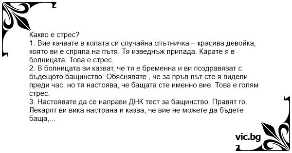 1. Вие качвате в колата си случайна спътничка – красива девойка, която ви е спряла на пътя. Тя изведнъж припада. Карате я в болницата. Това е стрес.