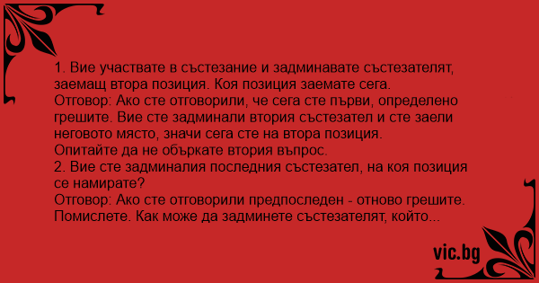 Отговор: Ако сте отговорили, че сега сте първи, определено грешите. Вие сте задминали втория състезател и сте заели неговото място, значи сега сте на втора позиция.
