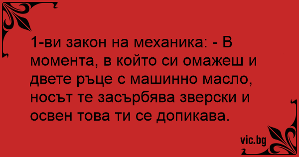 1-ви закон на механика: - В момента, в който си омажеш и двете ръце с машинно масло, носът те засърбява зверски и освен това ти се допикава.