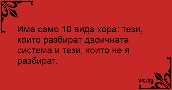Съществуват 10 вида хора. Тези които разбират двоичен код, и тези които не го разбират.