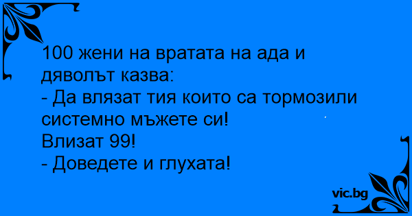 A mennyország kapuja előtt száz asszony várakozik bebocsátásra. Kilép a kapun Szent Péter, és így szól: - Azok akik megcsalták életükben a férjüket nem jöhetnek be! Távozzanak! Kilencvenkilenc...