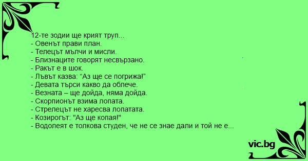 - Скорпионът взима лопатата, копае и си мисли: "Тоя да го закопая, че после имам още единайсет!"