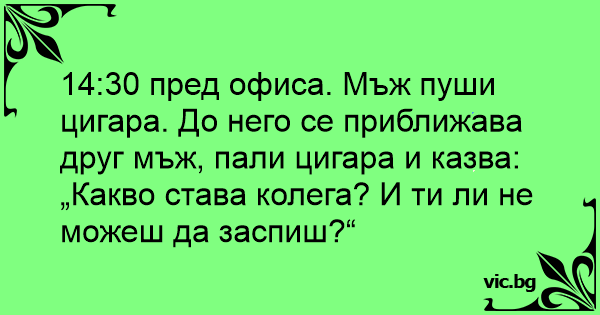 14:30 пред офиса. Мъж пуши цигара. До него се приближава друг мъж, пали цигара и казва: