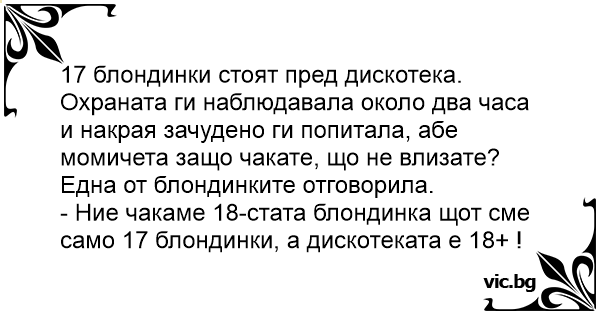 - Ние чакаме 18-стата блондинка щот сме само 17 блондинки, а дискотеката е 18+ !