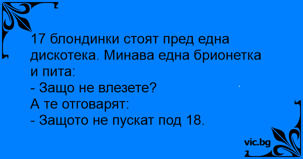 Det var en gång 17 blondiner som stod utanför en klubb. Efter ett tag frågade vakten: - Varför går ni inte in ?? Blondinerna: - Man måste va 18...!