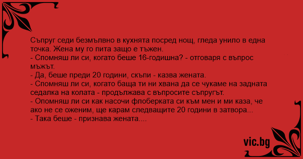 - Спомняш ли си, когато баща ти ни хвана да се чукаме на задната седалка на колата - продължава с въпросите съпругът.