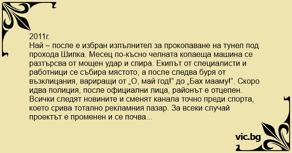 Най – после е избран изпълнител за прокопаване на тунел под прохода Шипка. Месец по-късно челната копаеща машина се разтърсва от мощен удар и спира. Екипът от специалисти и работници се събира мястото, а после следва буря от възклицания, вариращи от „О, май год!” до „Бaх мааму!”. Скоро идва полиция, после официални лица, районът е отцепен. Всички следят новините и сменят канала точно преди спорта, което срива тотално рекламния пазар. За всеки случай проектът е променен и се почва копаене на съвсем друго място, но и там се повтаря същото – удар и т.н.
