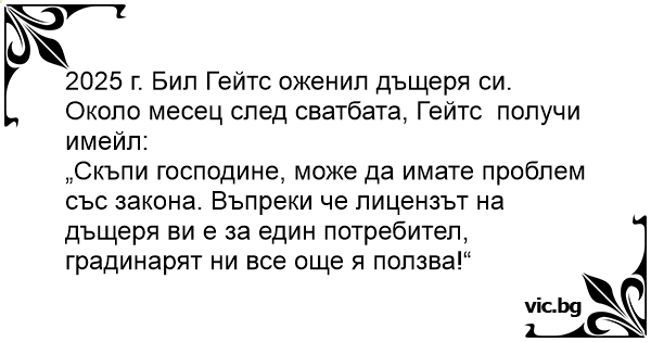 „Скъпи господине, може да имате проблем със закона. Въпреки че лицензът на дъщеря ви е за един потребител, градинарят ни все още я ползва!“