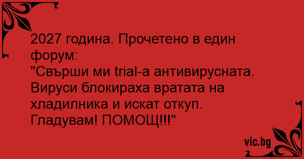 "Свърши ми trial-а антивирусната. Вируси блокираха вратата на хладилника и искат откуп. Гладувам! ПОМОЩ!!!"