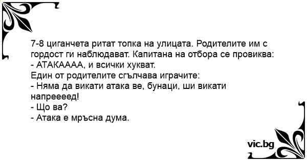 7-8 циганчета ритат топка на улицата. Родителите им с гордост ги наблюдават. Капитана на отбора се провиква: