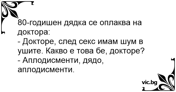 - Докторе, след cekc имам шум в ушите. Какво е това бе, докторе?
