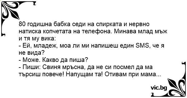 80 годишна бабка седи на спирката и нервно натиска копчетата на телефона. Минава млад мъж и тя му вика: