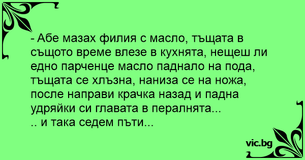 - Aбе мазах филия с масло, тъщата в същото време влезе в кухнята, нещеш ли едно парченце масло паднало на пода, тъщата се хлъзна, наниза се на ножа, после направи крачка назад и падна удряйки си главата в пералнята...