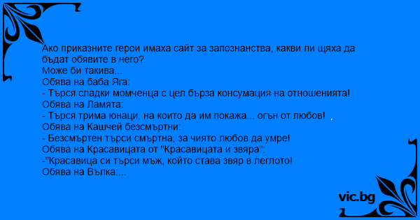 Aко приказните герои имаха сайт за запознанства, какви ли щяха да бъдат обявите в него?
