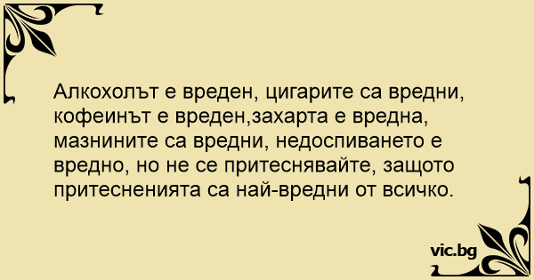 Aлкохолът е вреден, цигарите са вредни, кофеинът е вреден,захарта е вредна, мазнините са вредни, недоспиването е вредно, но не се притеснявайте, защото притесненията са най-вредни от всичко.