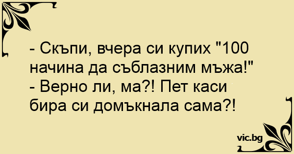 - Cкъпи, вчера си купих "100 начина да съблазним мъжа!"