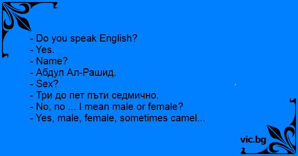 Q: Your name please? A: Abdul Aziz Q: Sex? A: Yes. Two times every week. Q: No no. I mean, Male or Female? A: Not matter. Sometimes also camel !