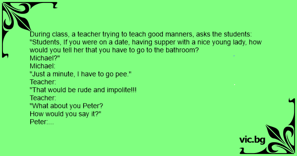 Učitel vykládá svým studentům o dobrých mravech a ptá se jednoho po druhém: „Tak Michaeli, kdybyste byl na schůzce s děvčetem a seděli byste v restauraci, jak byste jí řekl, že potřebujete na...