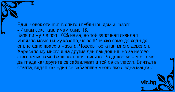 Каза ли му, че под 100$ няма, но той започнал скандал. Излязла маман и му казала, че за $1 може само да ходи да опъне едно прасе в мазата. Човекът останал много доволен. Харесало му много и на другия ден пак дошъл, но за негово съжаление вече били заклали свинята. За долар можело само да гледа как другите се забавляват и той се съгласил. Влязъл в стаята, видял как един се забавлява много яко с една мацка с големи бомби и казал: