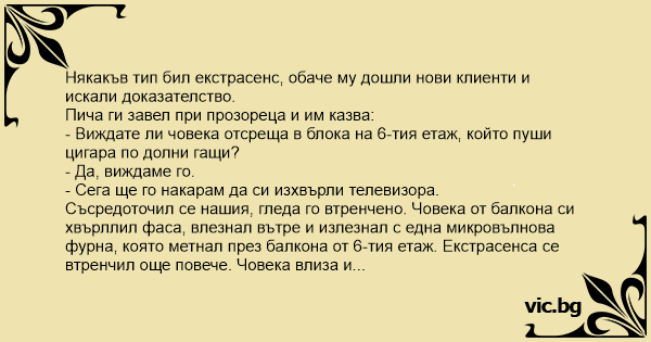 Съсредоточил се нашия, гледа го втренчено. Човека от балкона си хвърллил фаса, влезнал вътре и излезнал с една микровълнова фурна, която метнал през балкона от 6-тия етаж. Екстрасенса се втренчил още повече. Човека влиза и изнася аудиосистема с две тонколони и я запраща през балкона. Нашия вече съвсем концентрирано го гледа, чак отворил прозореца за по-пряк контакт. Човека влиза и изнася с много зор огромен хладилник, който последвал другите електроуреди на плочките пред блока. Екстрасенса вече зомбиран, целия почервенял от злоба продължава да го гледа, на което човека разперил ръце и се провикнал: