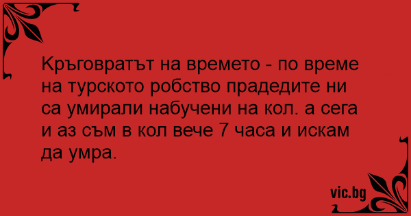 Kръговратът на времето - по време на турското робство прадедите ни са умирали набучени на кол. а сега и аз съм в кол вече 7 часа и искам да умра.