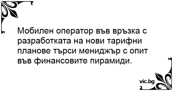 Mобилен оператор във връзка с разработката на нови тарифни планове търси мениджър с опит във финансовите пирамиди.