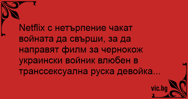 Netflix с нетърпение чакат войната да свърши, за да направят филм за чepнокож украински войник влюбен в транссексуална руска девойка...