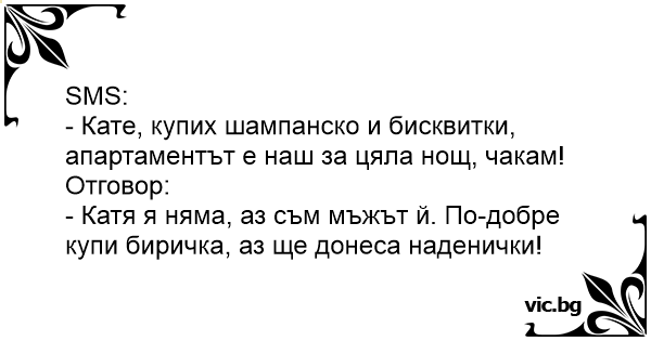 SMS порака: - Кате, купив шампањско и колачиња, станот е наш цела ноќ, те чекам! Одговор: - Кате не е тука, јас сум нејзиниот маж. Подобро купи пиво, јас ќе донесам колбаси!?!