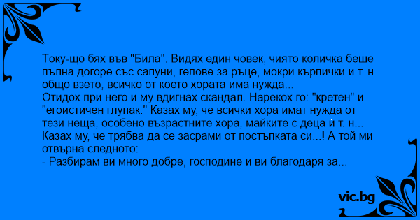 Отидох при него и му вдигнах скандал. Нарекох го: "кретен" и "егоистичен глупак." Казах му, че всички хора имат нужда от тези неща, особено възрастните хора, майките с деца и т. н... Казах му, че трябва да се засрами от постъпката си...! А той ми отвърна следното: