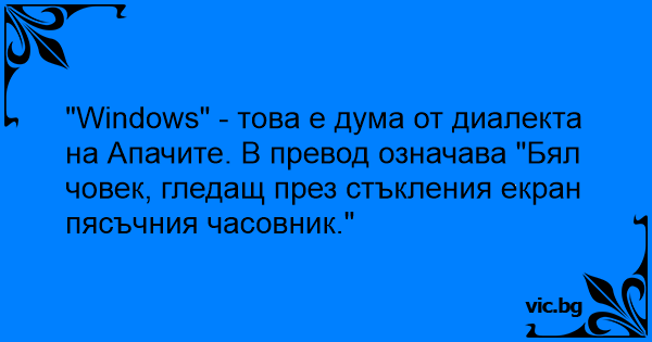 "Windows" - това е дума от диалекта на Апачите. В превод означава "Бял човек, гледащ през стъкления екран пясъчния часовник."